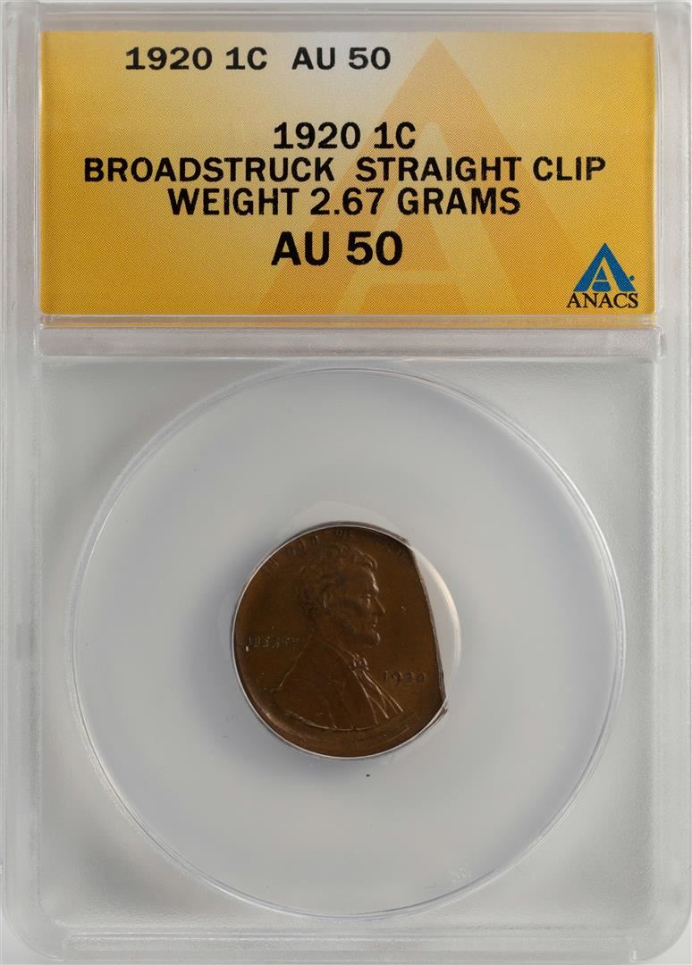 One 1920 Lincoln Wheat Cent Coin Broadstruck Straight Clip Error ANACS AU50. ANACS Certified.