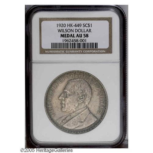 <B>1920 Wilson Dollar AU58 NGC.</B></I> HK-449. A satiny piece with deep dove-gray and olive toning. Never in circulation, but the obverse has a hint of environmental damage. This So-Called Dollar commemorated the opening of the Manila Mint in the Philippines. Wilson is depicted on the obverse despite being incapacitated from a stroke at the time.<BR><I>From The Henry R. Luhrs Collection.</B></I>