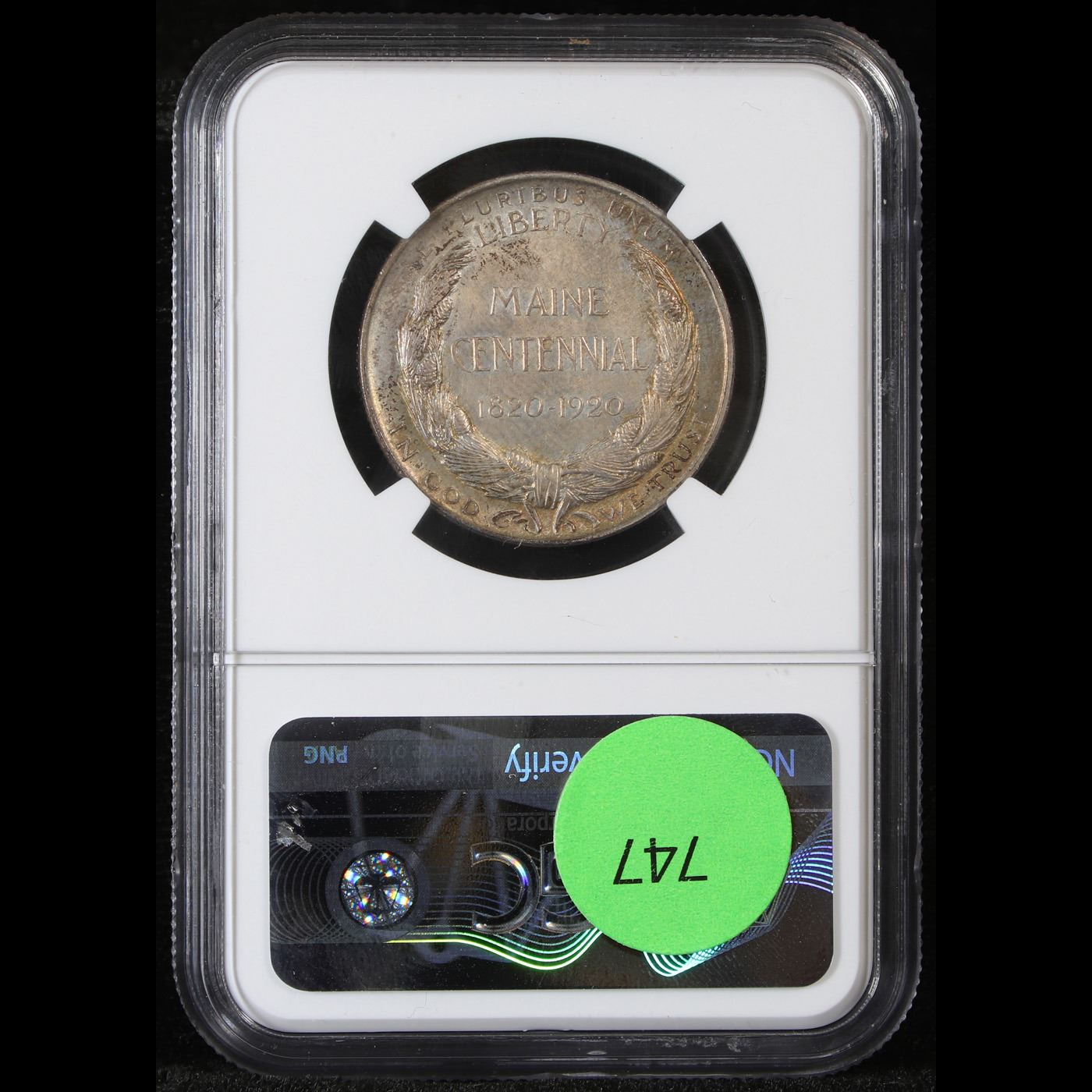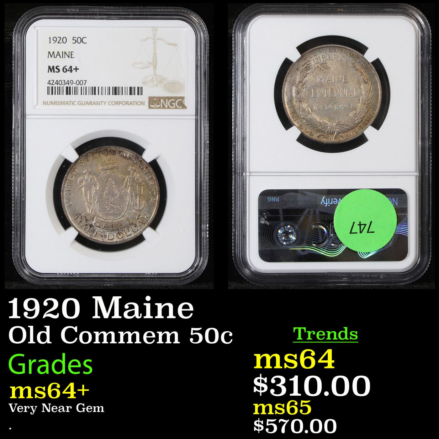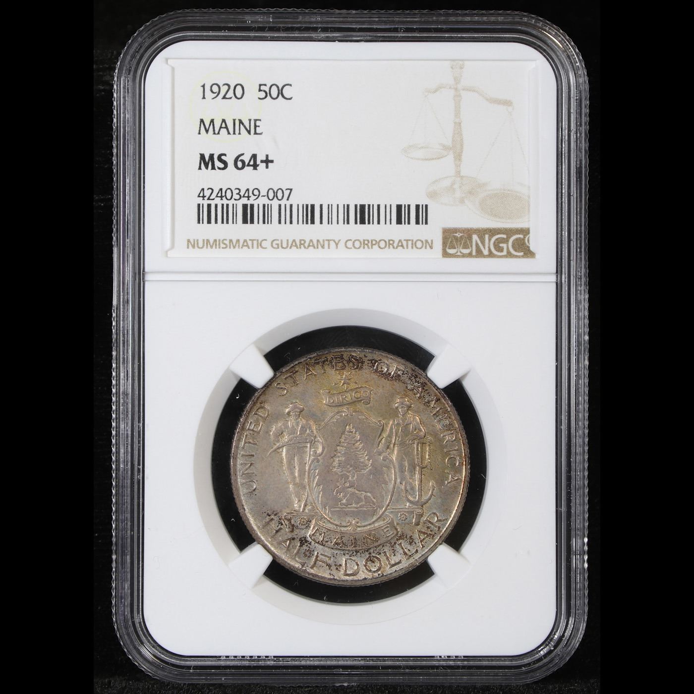 1920 Maine Old Commem Half Dollar 50c Graded ms64+ By NGC. When looking at a Maine Commemorative, wear First Appears on the Hands Adjacent to the Escutcheon and on the Wreath’s Bow Knot. 0