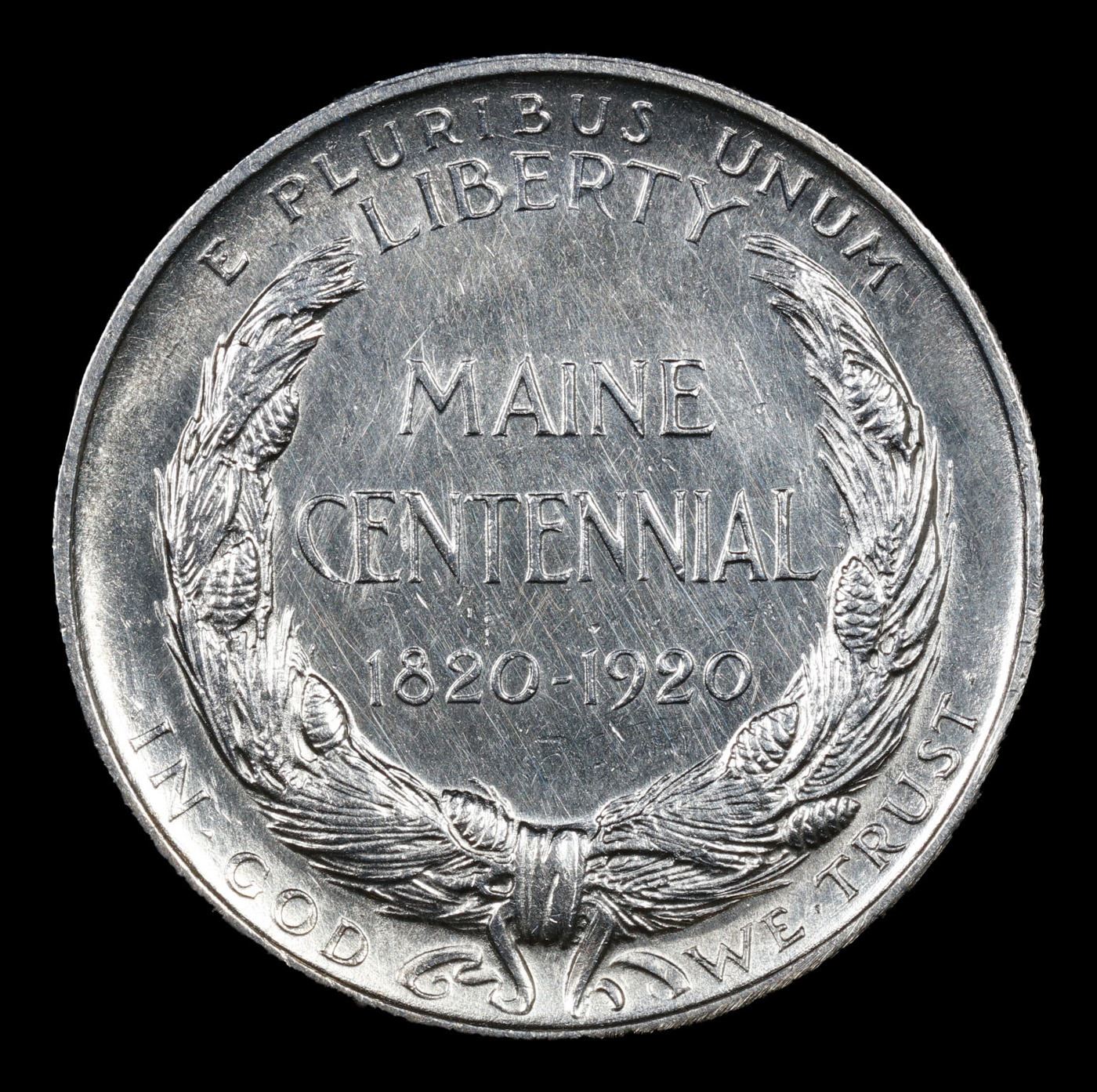 1920 Maine Old Commem Half Dollar 50c Grades Choice+ Unc. When looking at a Maine Commemorative, wear First Appears on the Hands Adjacent to the Escutcheon and on the Wreath’s Bow Knot.