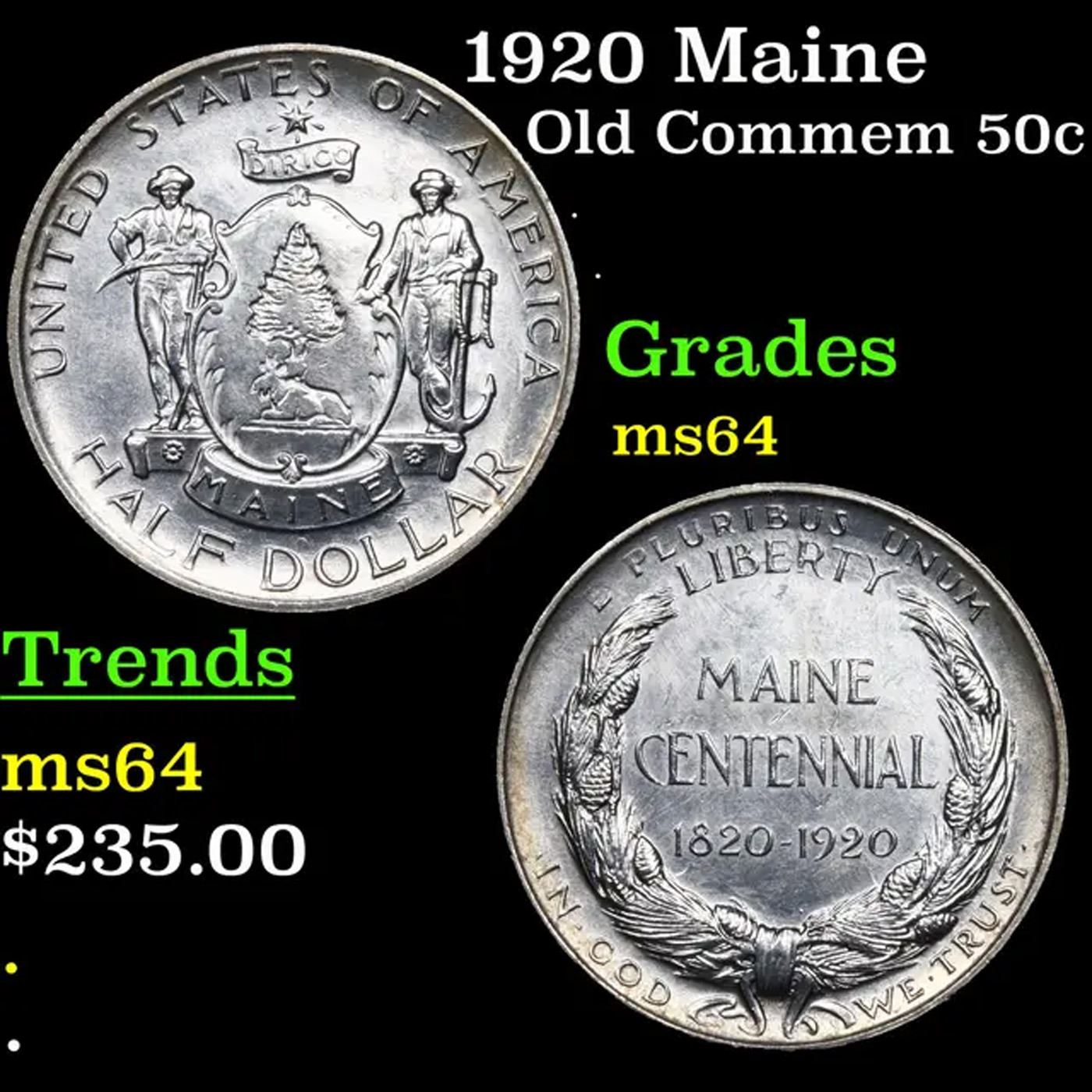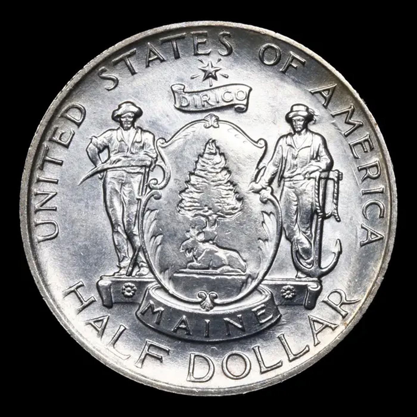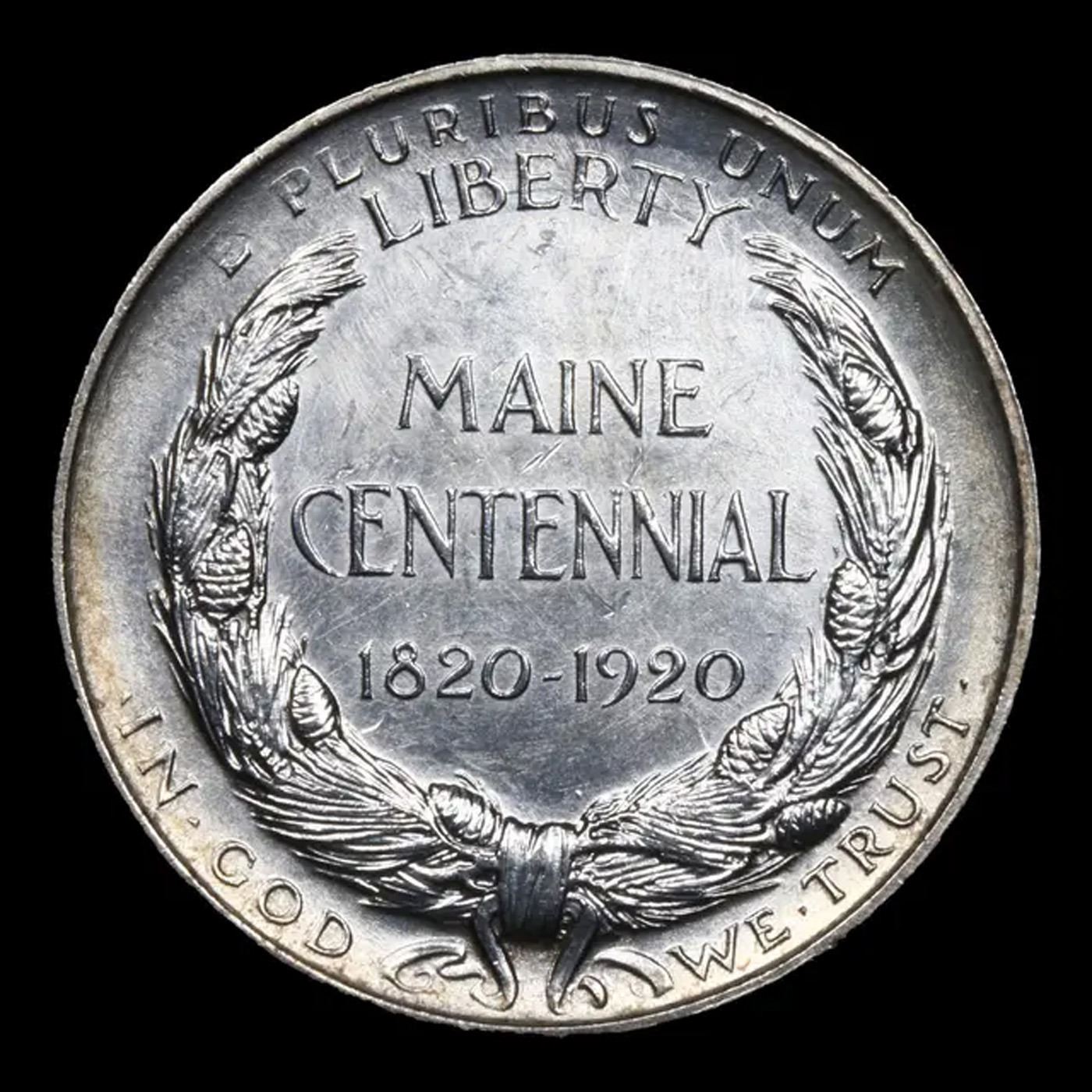 1920 Maine Old Commem Half Dollar 50c Grades Choice Unc. When looking at a Maine Commemorative, wear First Appears on the Hands Adjacent to the Escutcheon and on the Wreath’s Bow Knot.