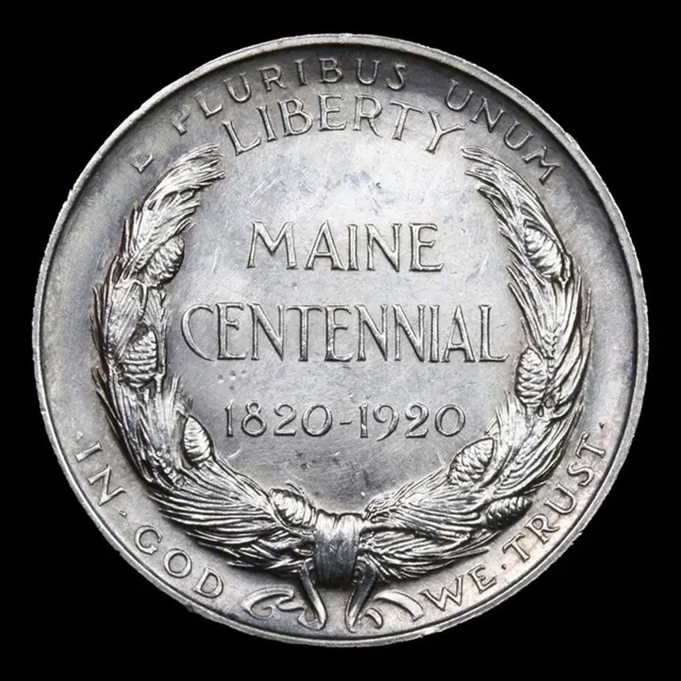 1920 Maine Old Commem Half Dollar 50c Grades Choice+ Unc. When looking at a Maine Commemorative, wear First Appears on the Hands Adjacent to the Escutcheon and on the Wreath’s Bow Knot.