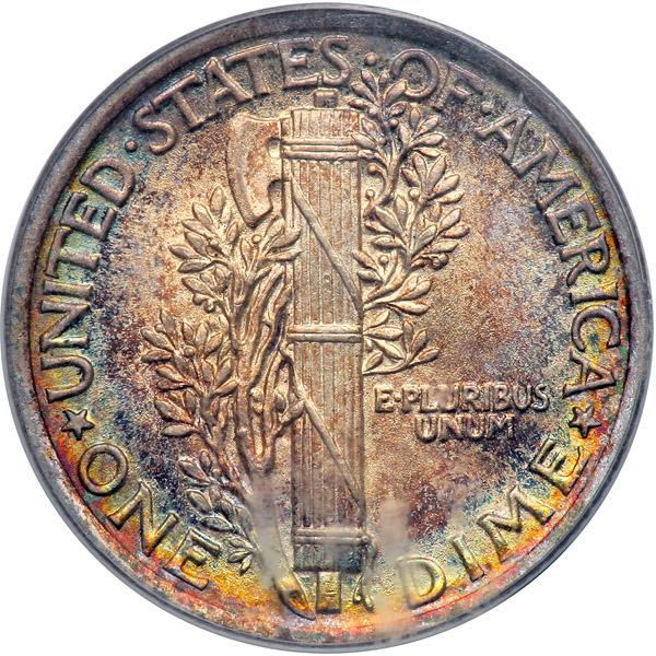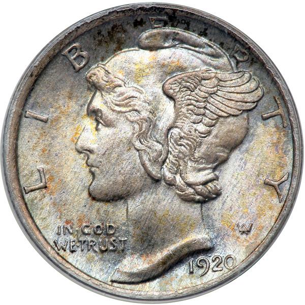 1920 Mercury Dime. PCGS graded MS-66 Full Bands. Lovely blue and golden toning over lustrous surfaces. Bold strike. Pop 86; 13 finer in 67 (PCGS # 4929) .