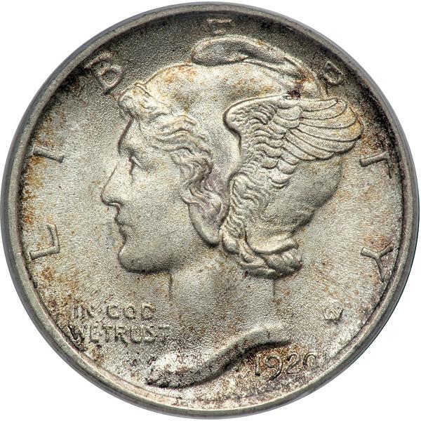 1920 Mercury Dime. PCGS graded MS-64 PQ. Nice light toning and boldly struck. The bands are almost full. Pop 64; 30 finer (PCGS # 4928) .