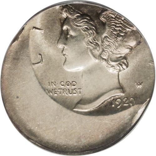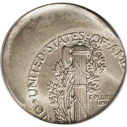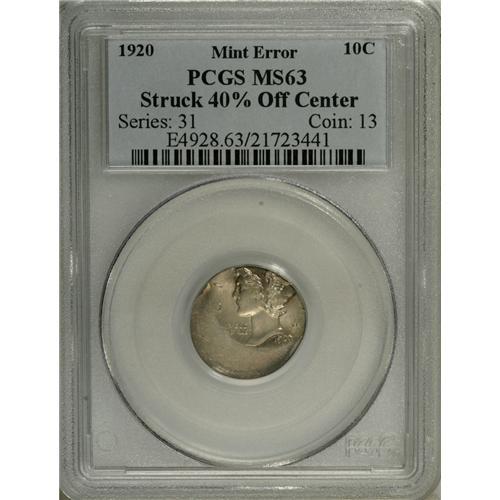 <B>1920 Mercury Dime--Struck 40% Off Center--MS63 PCGS.</B></I> Struck off center toward 1 o'clock on the obverse. Frosty luster throughout and boldly struck where impressed. The surfaces are very pleasing for the grade, with a blush of faint gold toning starting to form, and no problematic marks are visible. It is impossible to tell which Mint created this piece, though the detail is more characteristic of Philadelphia than a branch mint.<BR><BR><b>Shipping:</b> Coin/Currency (<a target="_blank" href="http://www.heritageauctions.com/common/shipping.php">view shipping information</a>)