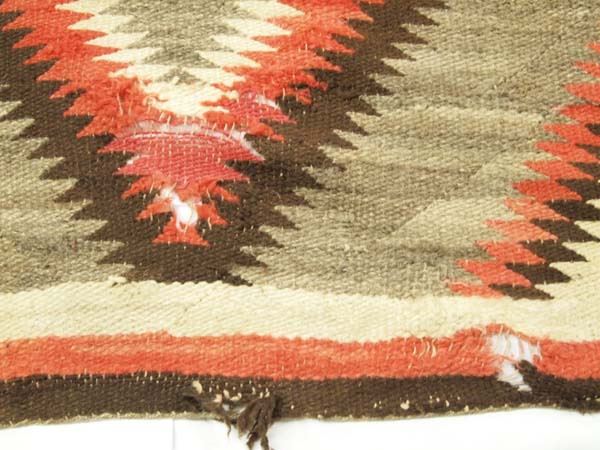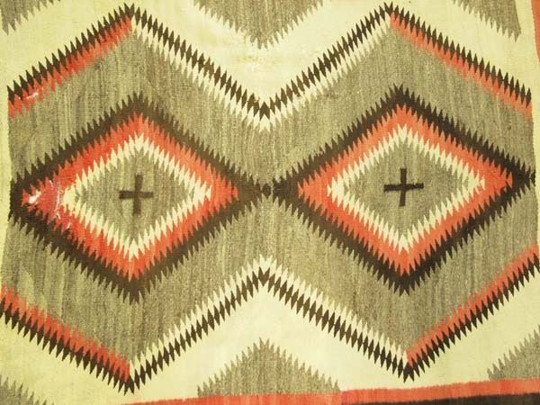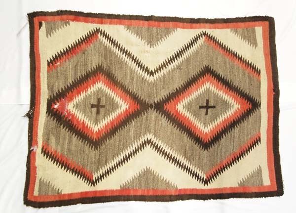 1920 Native American Navajo Cross Directional Textile Rug, measures 54'' x 74'', threadbare places, some holes, selvage damage