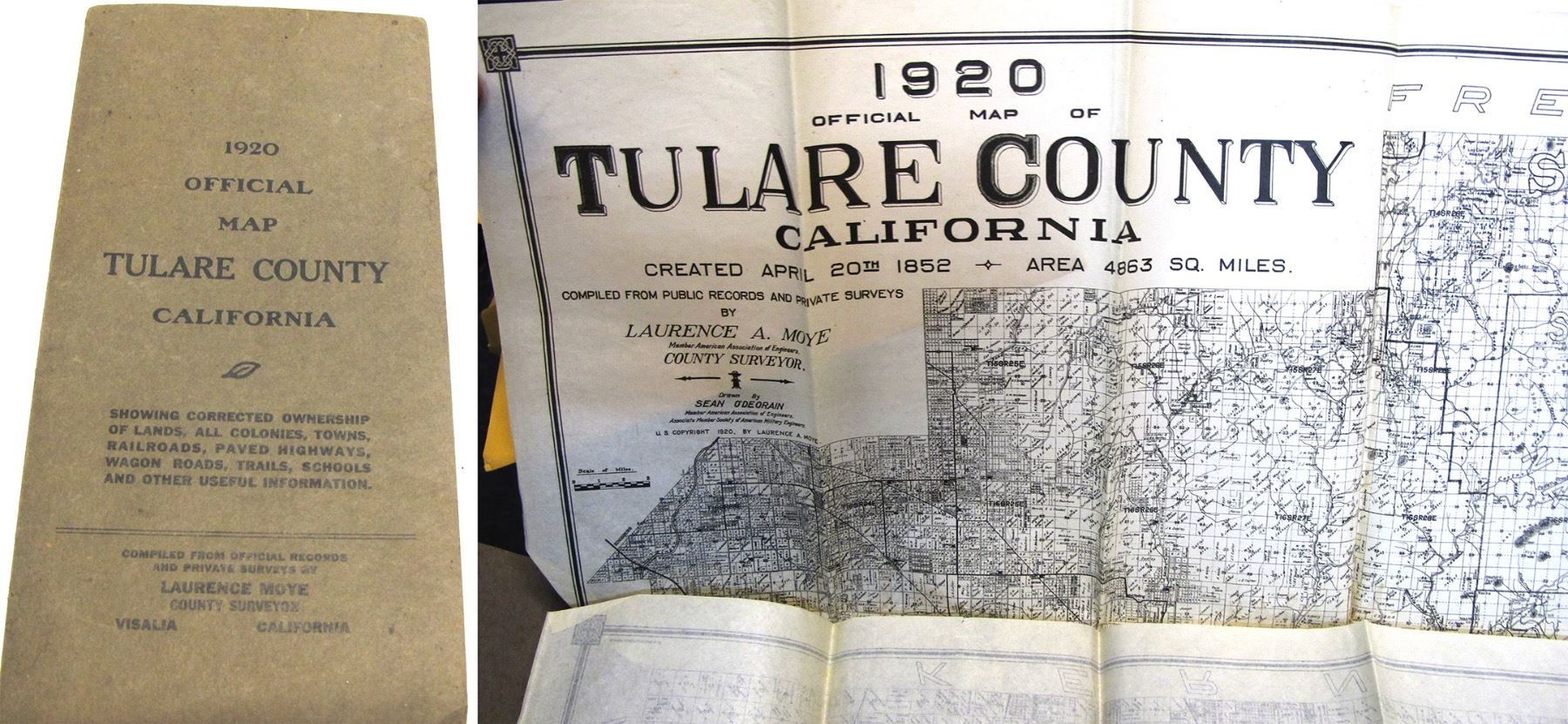 A large pocket map of Tulare County, CA 1920. Brown binder with rear stain, 9.75" x 5". Map is 27.5" x 30". Two tears on left side of map. Date: Location: Tulare County, California HWAC # 53615