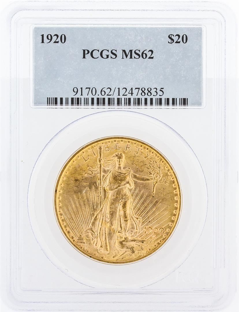 One 1920 PCGS MS62 $20 St. Gaudens Double Eagle Gold Coin. PCGS Certified.