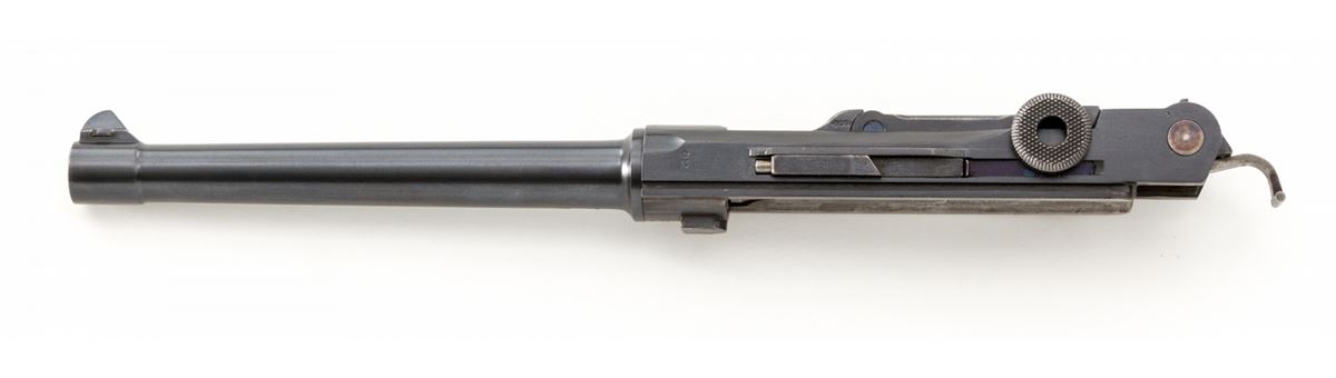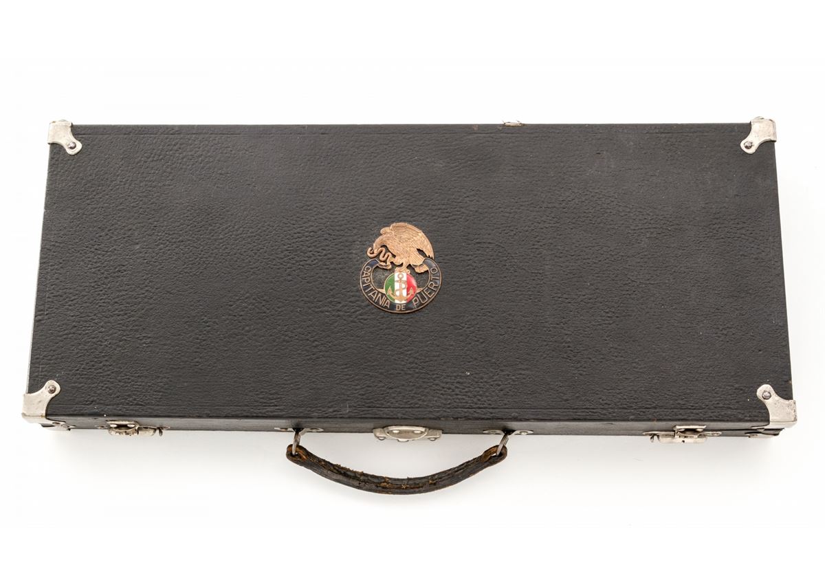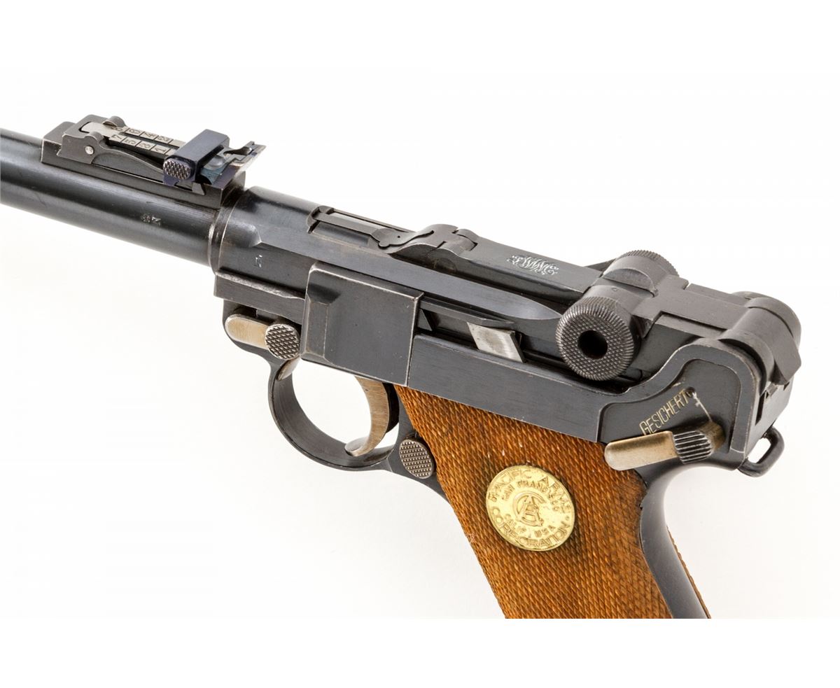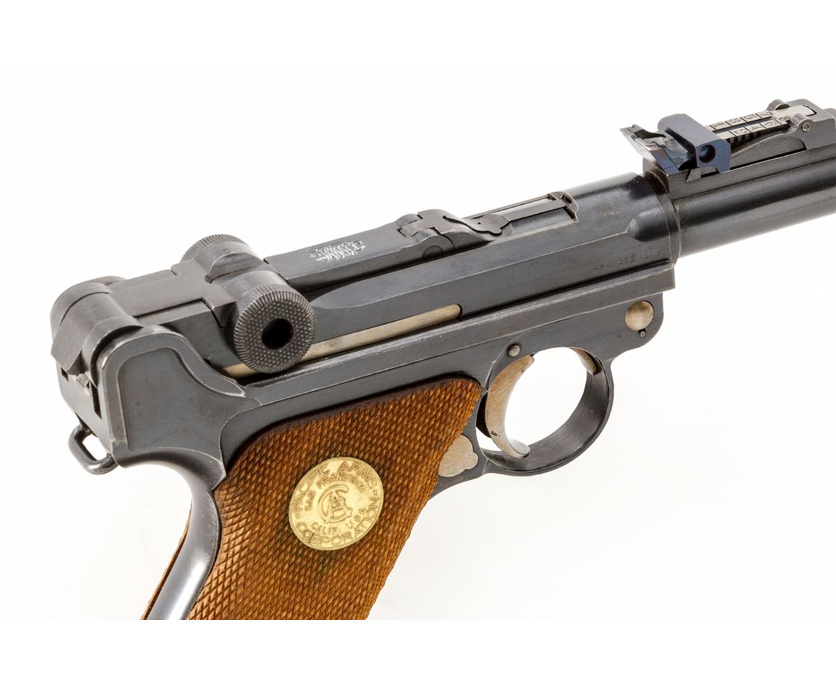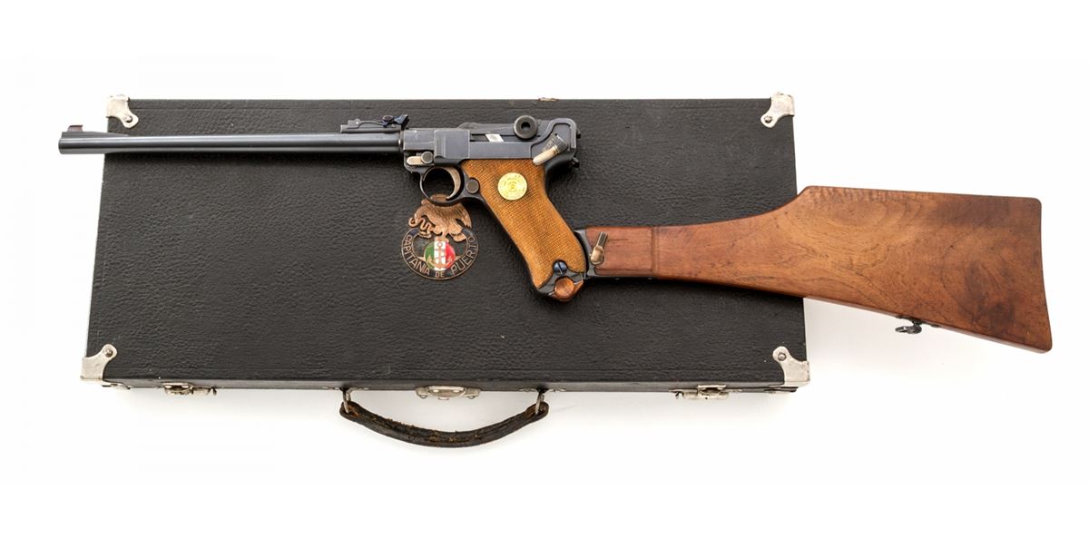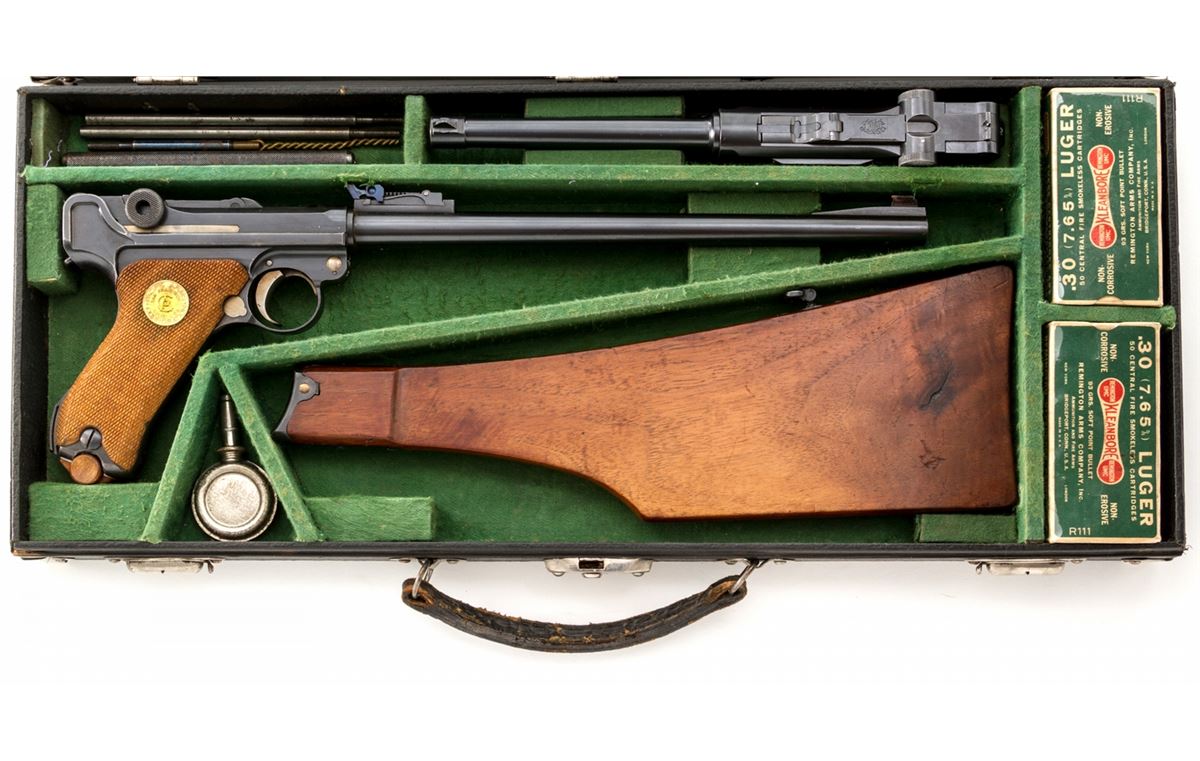 1920 Pacific Arms Luger Carbine, #1702n, .30 Luger cal., 11-1/4'' barrel, with additional 6'' 9mm upper barrel assembly with toggle; blue finish with straw small parts, factory checkered walnut grips with Pacific Arms medallions to both panels, and one unmarked tin-plated magazine with walnut base, and flat board stock with unmarked attaching iron, stock marked ''Made in Germany''; ''(crown)/N'' proofmarks to both barrels and upper receivers; with oiler and two boxes of Remington Kleenbore .30 cal. ammunition, as well as cleaning rods and jags, in period Moroccan leather case with Mexican ''Capitania de Puerto'' (Port Captain) cloisonn‚ crest with eagle and anchor motif to top of lid. Condition is excellent possibly showing very light restoration. Pistol retains approx. 97% rust blue with wear at high edges and minor oil staining to grips. Both actions remain crisp with fine bright bores. Interior of case shows even general wear to green cotton interior. Est.: $8,000-$12,000. (C&R/PPT) (John Siroonian estate)