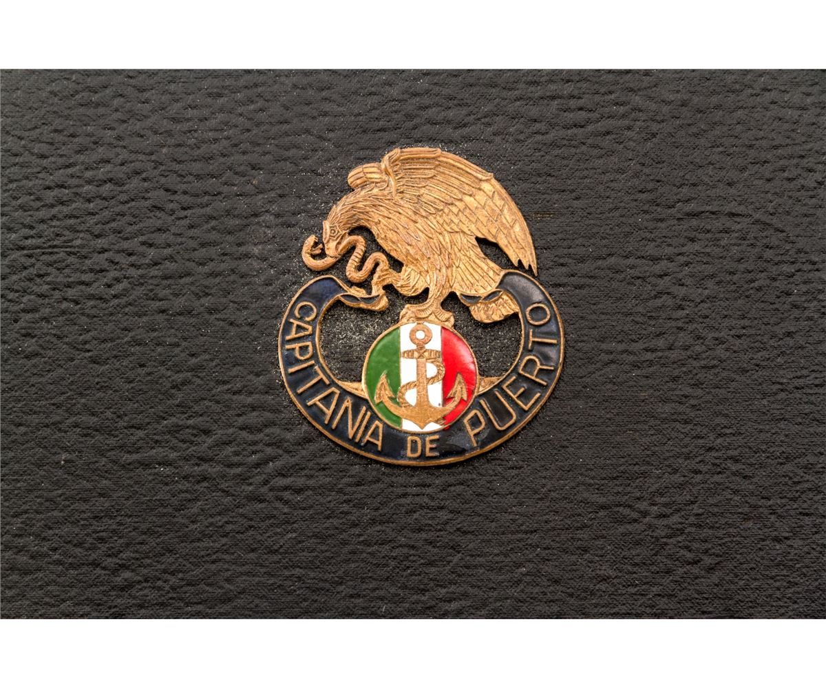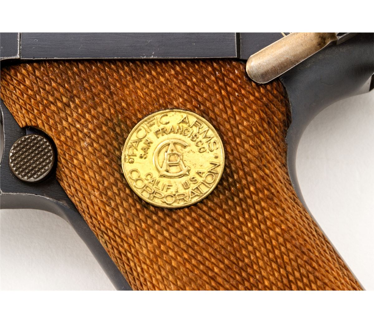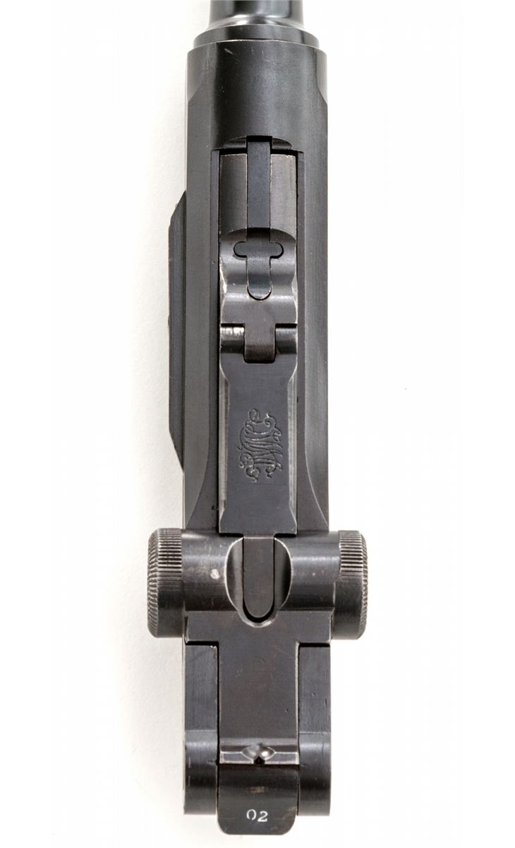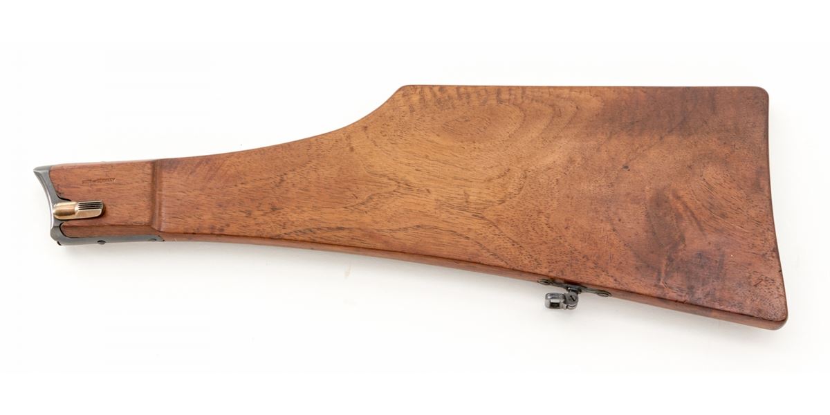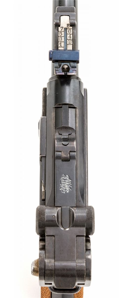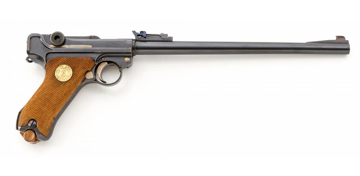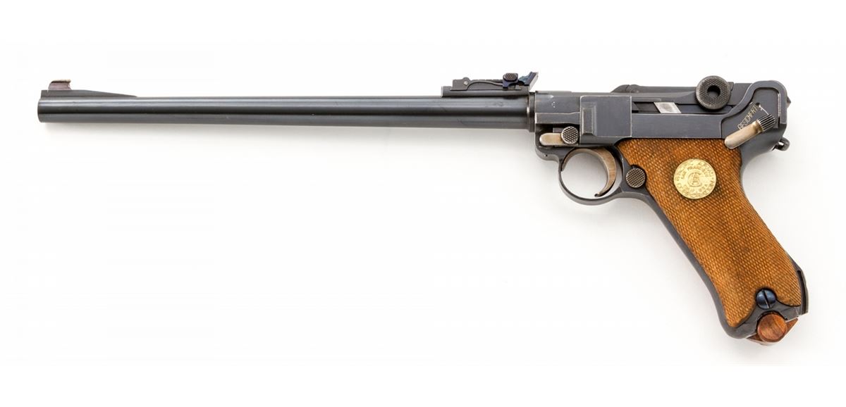 1920 Pacific Arms Luger Carbine, #1702n, .30 Luger cal., 11-1/4'' barrel, with additional 6'' 9mm upper barrel assembly with toggle; blue finish with straw small parts, factory checkered walnut grips with Pacific Arms medallions to both panels, and one unmarked tin-plated magazine with walnut base, and flat board stock with unmarked attaching iron, stock marked ''Made in Germany''; ''(crown)/N'' proofmarks to both barrels and upper receivers; with oiler and two boxes of Remington Kleenbore .30 cal. ammunition, as well as cleaning rods and jags, in period Moroccan leather case with Mexican ''Capitania de Puerto'' (Port Captain) cloisonn‚ crest with eagle and anchor motif to top of lid. Condition is excellent possibly showing very light restoration. Pistol retains approx. 97% rust blue with wear at high edges and minor oil staining to grips. Both actions remain crisp with fine bright bores. Interior of case shows even general wear to green cotton interior. Est.: $8,000-$12,000. (C&R/PPT) (John Siroonian estate)