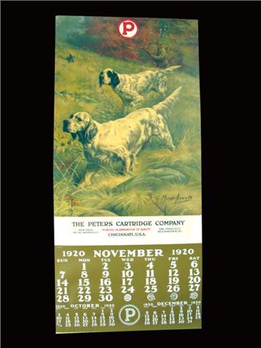 1920 Peters Cartridge Co. Calendar, G.Muss-Arnolt artist. Depicts two setter in a field with a hunter. No bands, Nov and Dec pages only. Restoration to top logo, slight paper loss at 12:00, normal edge ware otherwise very good condition. Framed and matted. 14 1/4 X 31 inches.