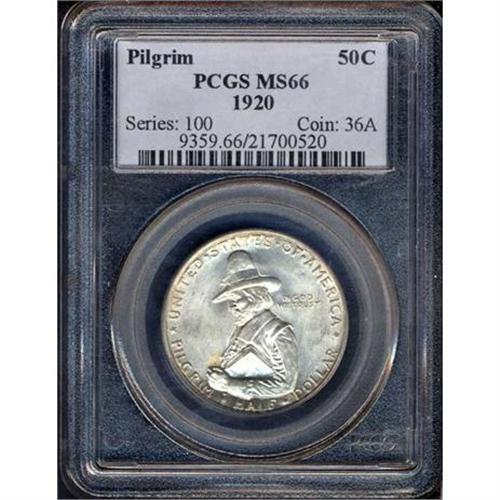 <b>1920 Pilgrim Half Dollar. PCGS graded MS66.</b> Fully brilliant, the silvery white surfaces display few noticeable abrasions, the opportunity to strike a commemorative half dollar on the 300th anniversary of the landing of the Pilgrims meant that the U.S. government struck a very large number of these. Many were later put into circulation as unsold (which explains the prevalence of high grade Very Fine to About Uncirculated specimens). A frosty Gem <b>(PCGS # 9359)</b>