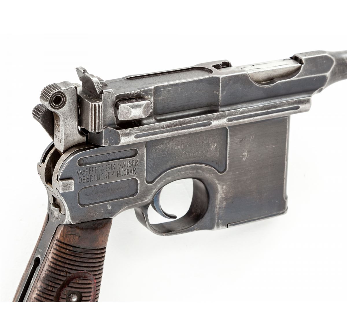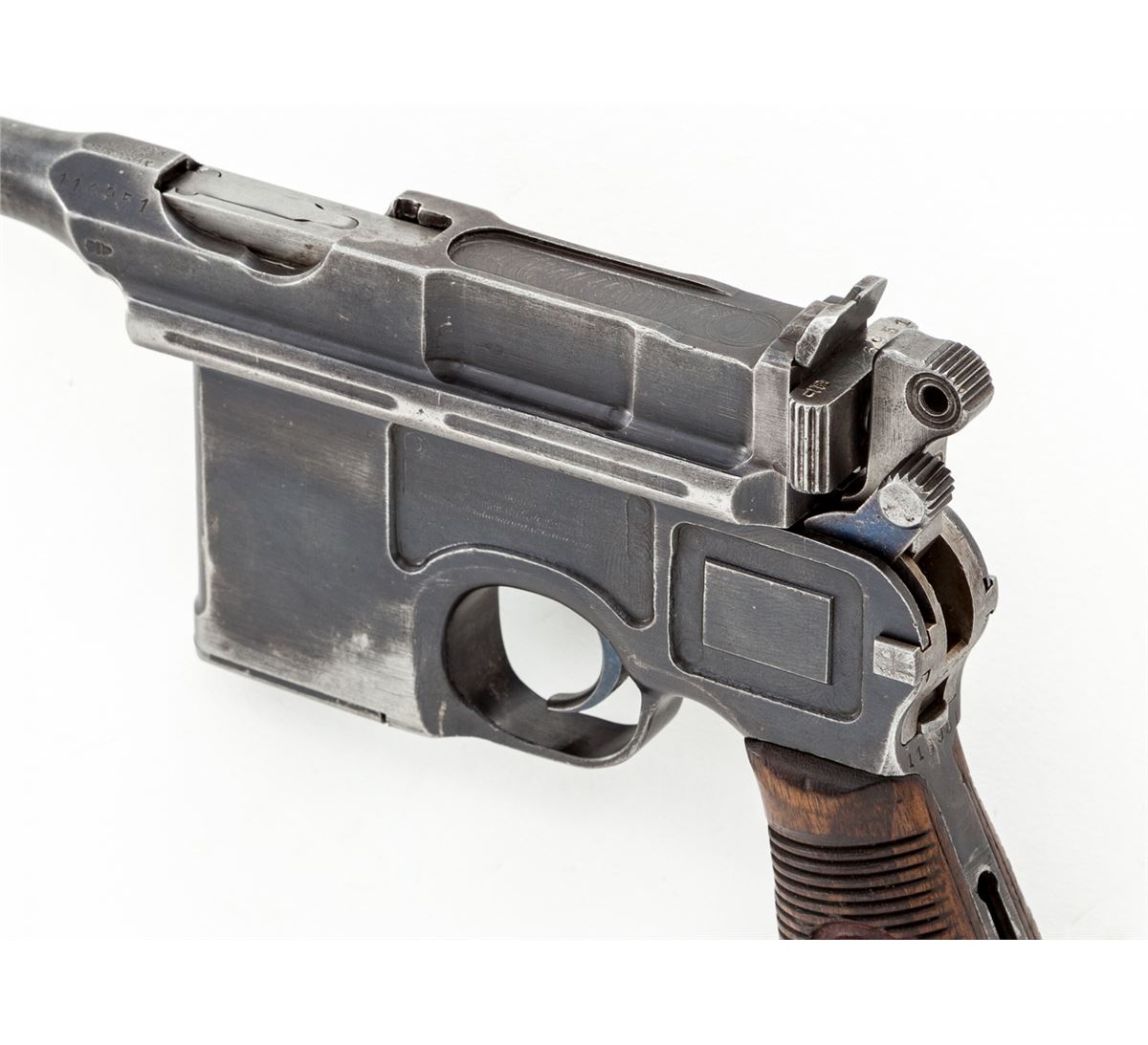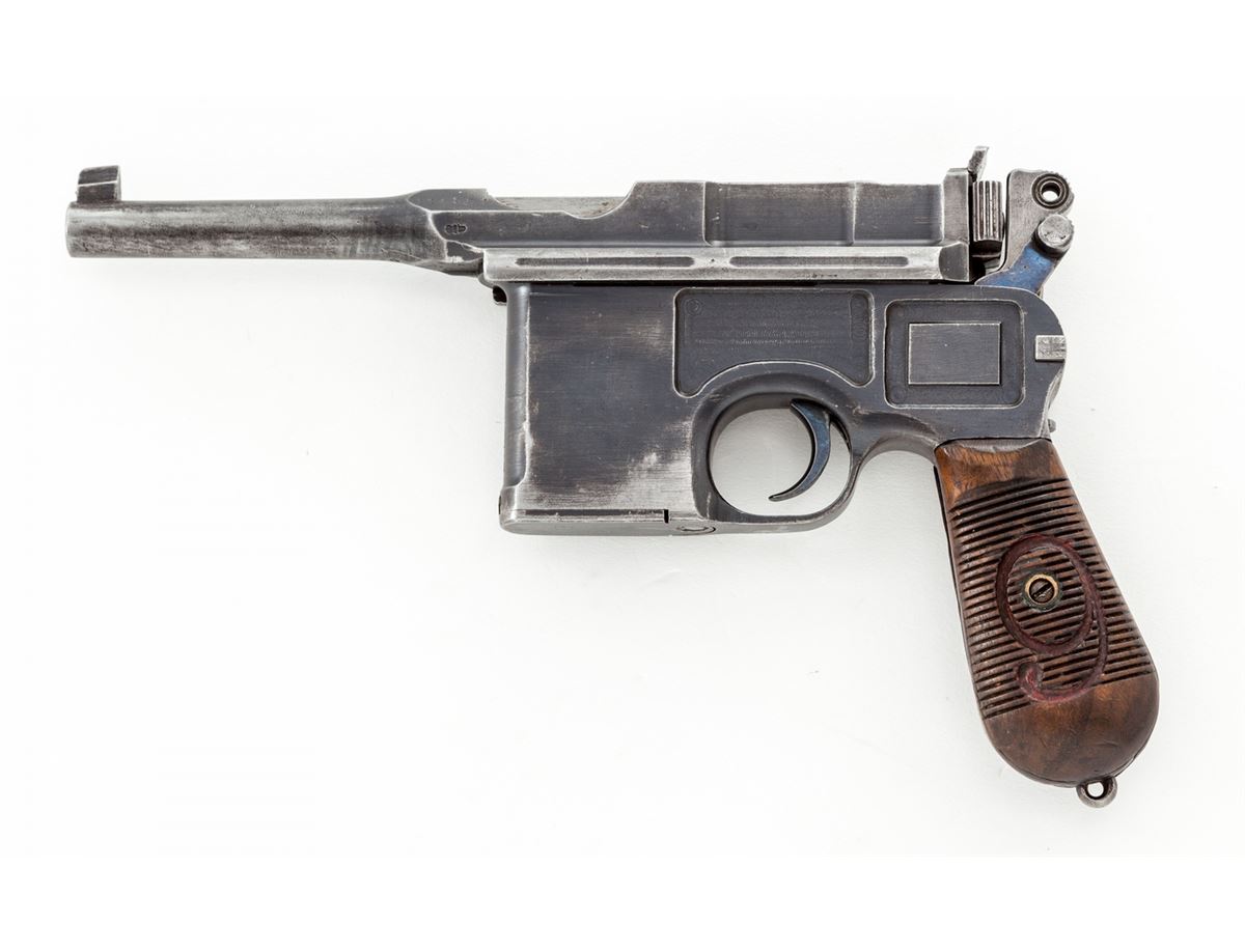 1920 Rework Red 9 Broomhandle Mauser, #116951, 9mm, 3.9'' barrel, blue finish, 24-groove Red 9 walnut grips, with fixed rear sight. Front strap marked with police or regimental markings that have been crossed out; front gripstrap marked ''S. KoI. N.O.126''. With mismatched shoulder stock (503). Condition is very good to near fine retaining approx. 85% original blue. Grips with light dings and oil darkening. Crisp action, fine bore. Stock with light scuffs, small impressions, and oil darkening. Est.: $1,000-$1,500. (C&R/PPT)