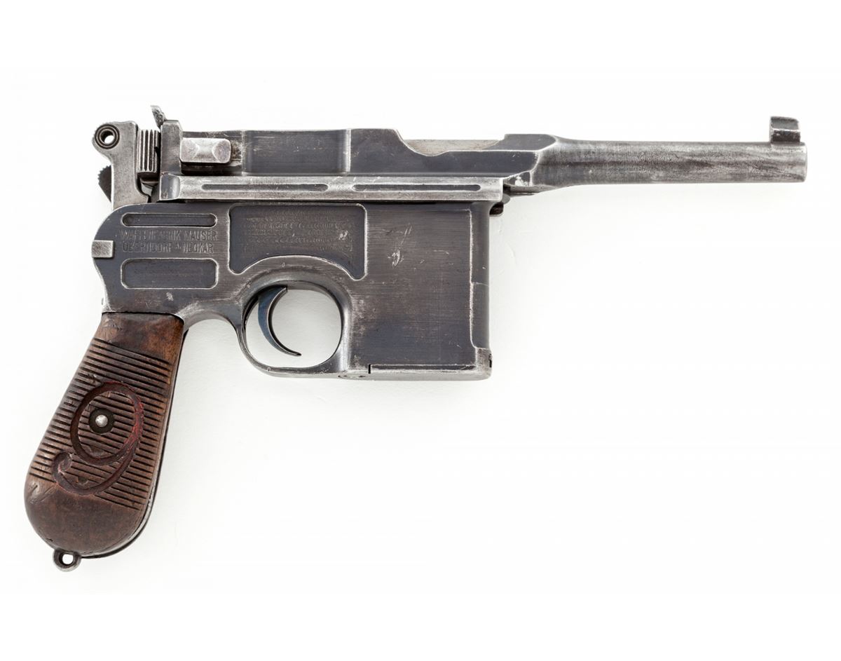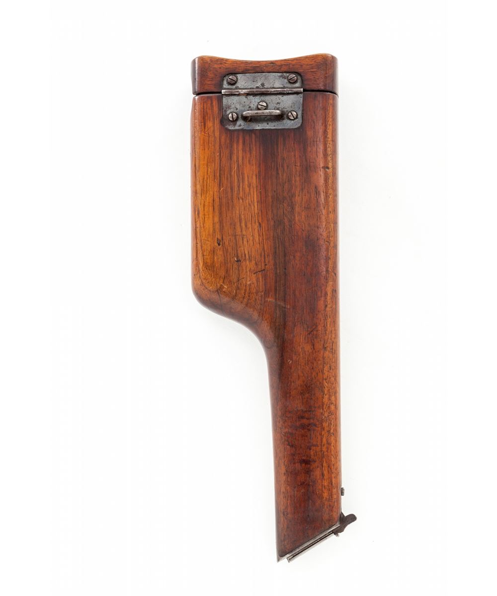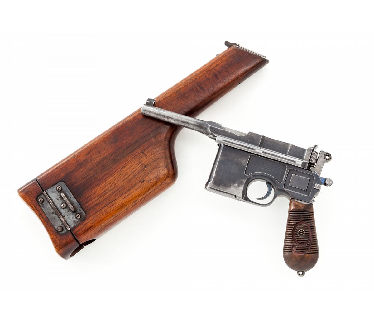 1920 Rework Red 9 Broomhandle Mauser, #116951, 9mm, 3.9'' barrel, blue finish, 24-groove Red 9 walnut grips, with fixed rear sight. Front strap marked with police or regimental markings that have been crossed out; front gripstrap marked ''S. KoI. N.O.126''. With mismatched shoulder stock (503). Condition is very good to near fine retaining approx. 85% original blue. Grips with light dings and oil darkening. Crisp action, fine bore. Stock with light scuffs, small impressions, and oil darkening. Est.: $1,000-$1,500. (C&R/PPT)