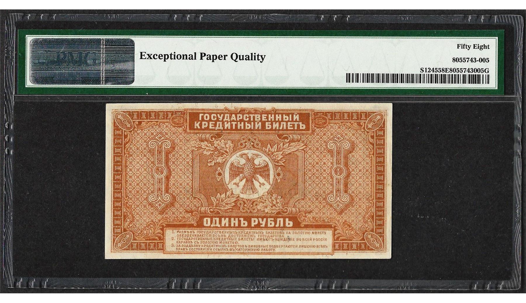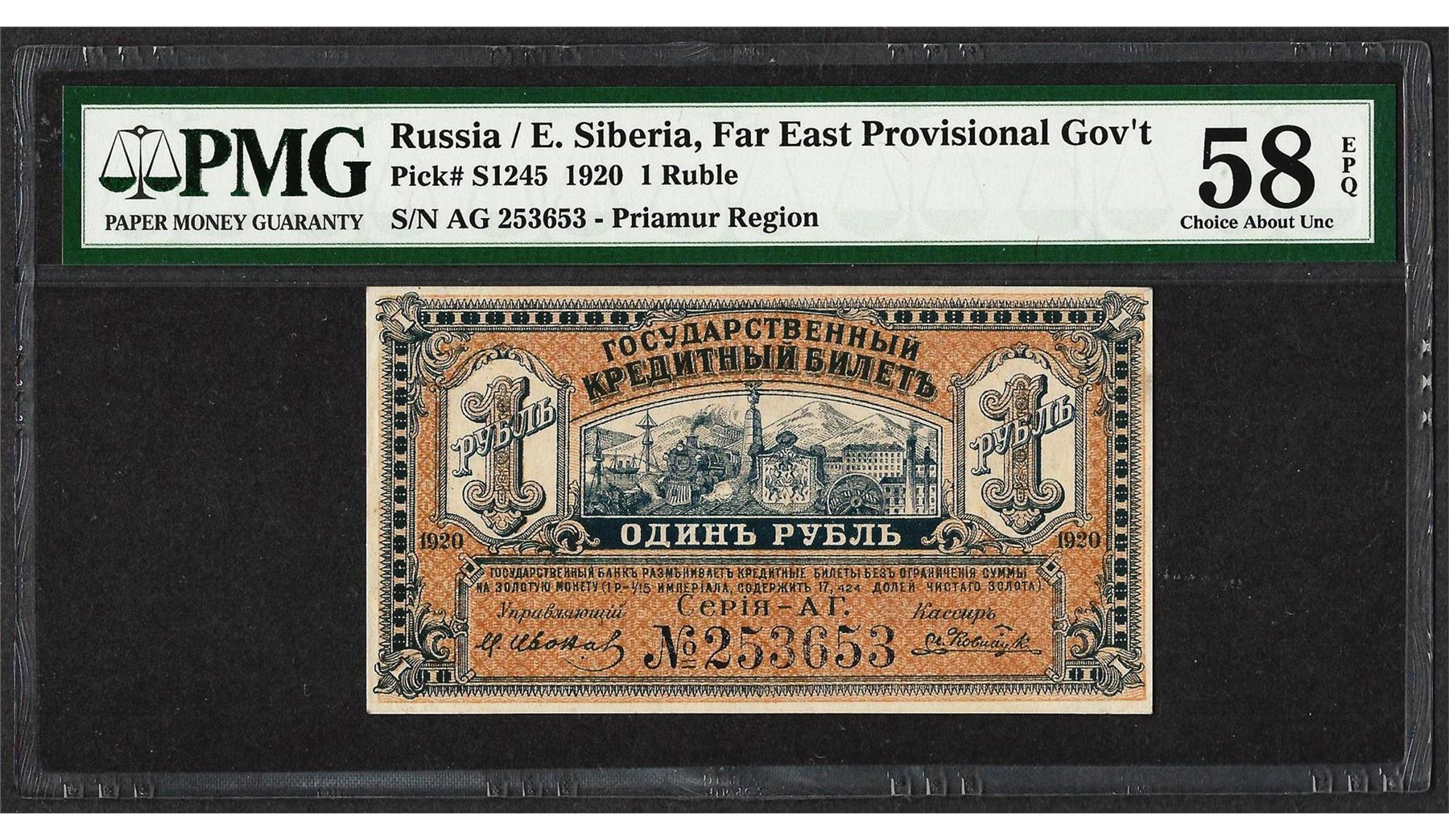 One 1920 Russia E. Suberia Far East Provisional Gov't 1 Ruble Note PMG Choice About Unc. 58EPQ. PMG Certified.