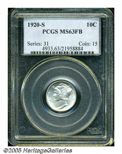 1920-S 10C MS63 Full Bands PCGS. Bright, lustrous