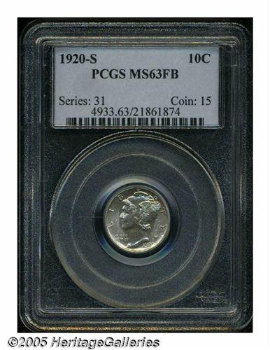 <B>1920-S<10C> MS63 Full Bands PCGS.</B></I> Well struck example, with ample luster and some scattered, light, variegated toning. Some scattered contact marks are noted, and some die-polish lines, as made, are seen in the left obverse field.