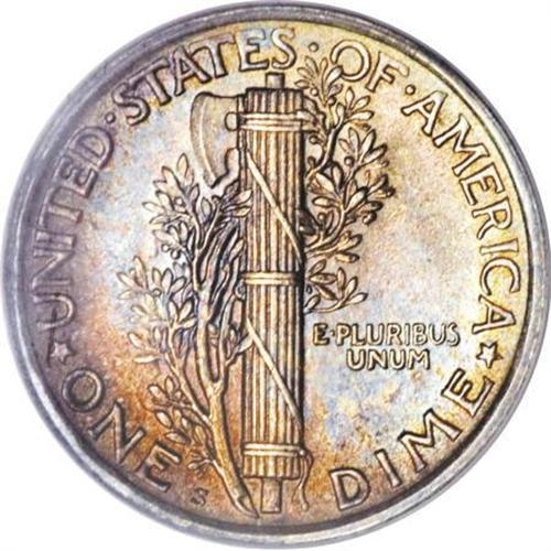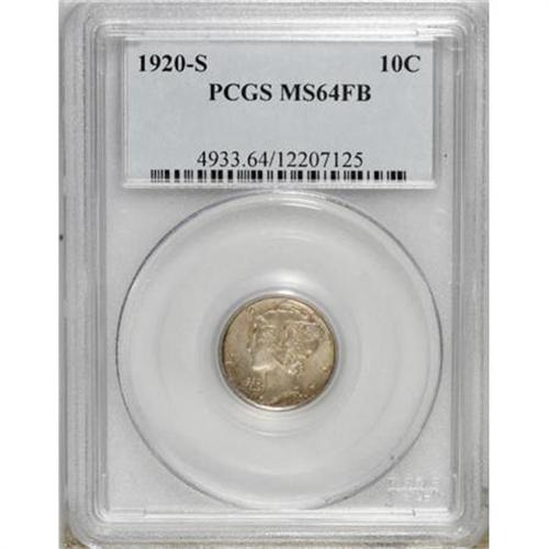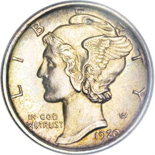 <B>1920-S 10C MS64 Full Bands PCGS.</B></I> A scarce Mercury dime in spite of a rather substantial mintage of 13.8 million pieces. This piece is particularly sharp with only the slightest fadeaway on the 0 in the date and ES in STATES. The subdued, satiny surfaces show an intermixture of blue-green and rose toning over each side.<BR><BR><B>Coin Engraver:</B> Adolph A. Weinman<BR><BR><b>Shipping:</b> Coins & Currency (<a target="_blank" href="http://www.heritageauctions.com/common/shipping.php">view shipping information</a>)