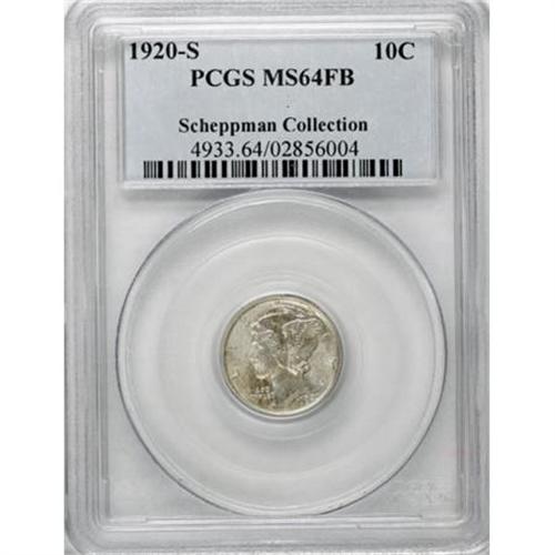 <B>1920-S 10C MS64 Full Bands PCGS.</B></I> Delicate gold and cream patina drapes the strongly lustrous surfaces of this crisply struck near-Gem. Beneath the toning lies a pleasingly preserved and lovely survivor from this challenging San Francisco issue.<BR><I>From The Scheppman Collection, #4 PCGS Registry of Full Band Mercury Dimes.</B></I><BR><BR><B>Coin Engraver:</B> Adolph A. Weinman<BR><BR><b>Shipping:</b> Coins & Currency (<a target="_blank" href="http://www.heritageauctions.com/common/shipping.php">view shipping information</a>)