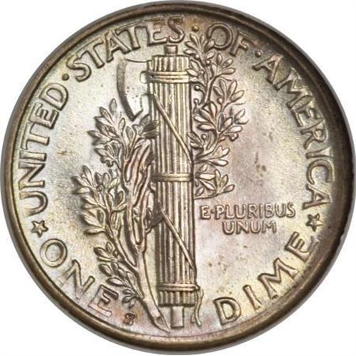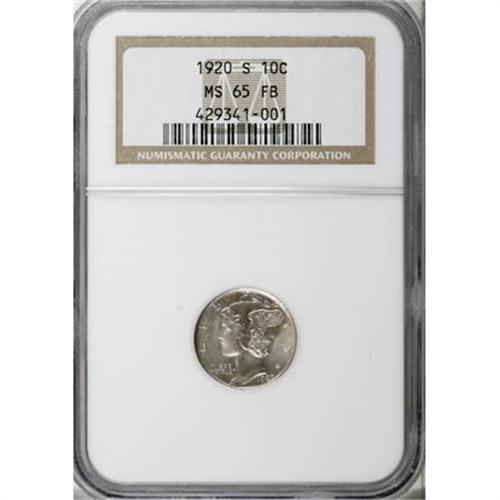 <B>1920-S 10C MS65 Full Bands NGC.</B></I> This marvelous coin is in the distinct minority in two ways: Not only does it display Full Bands details as certified by NGC, but it also demonstrates a full date, without the "fadeaway" on the 0 of the date that so many pieces of this issue exhibit. A third attraction is the splendid pale pastel colors, with light jade and pink predominating through the cartwheel luster. Census: 18 in 65 Full Bands, 4 finer (3/08).<BR><BR><B>Coin Engraver:</B> Adolph A. Weinman<BR><BR><b>Shipping:</b> Coins & Currency (<a target="_blank" href="http://www.heritageauctions.com/common/shipping.php">view shipping information</a>)