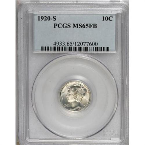 <B>1920-S 10C MS65 Full Bands PCGS.</B></I> The final S-mint dime until 1923, more than 13 million pieces were struck of the 1920-S but Gem examples are seldom seen. This is an exceptional coin that displays bright, coruscating mint frost. The centers show unusually strong definition. Brilliant throughout and a problem-free coin, as one would expect from a Gem. Population: 26 in 65, 10 finer (8/07).<BR><BR><B>Coin Engraver:</B> Adolph A. Weinman<BR><BR><b>Shipping:</b> Coins & Currency (<a target="_blank" href="http://www.heritageauctions.com/common/shipping.php">view shipping information</a>)