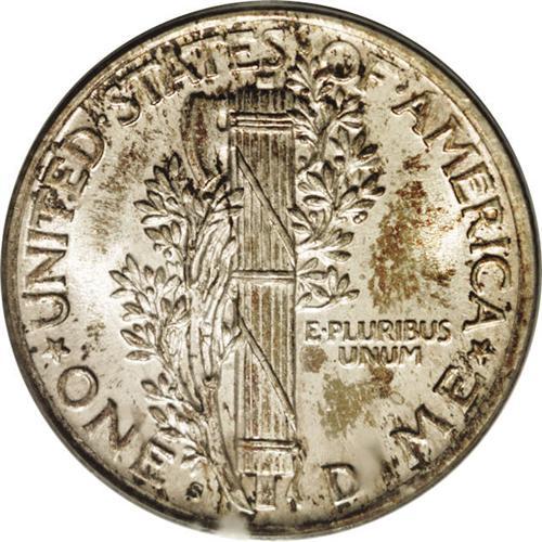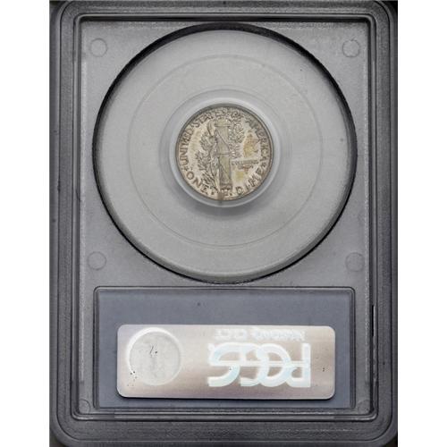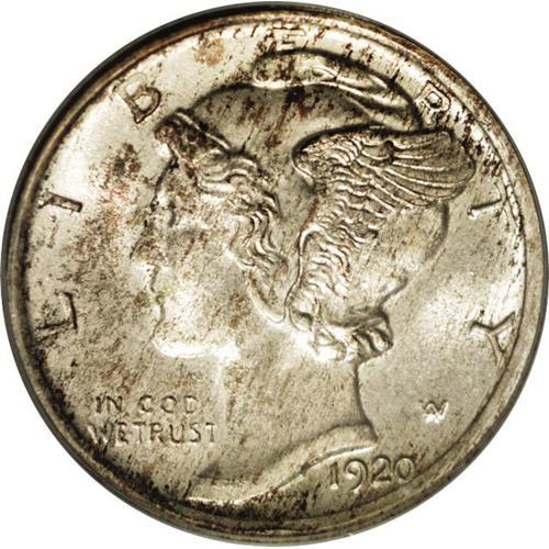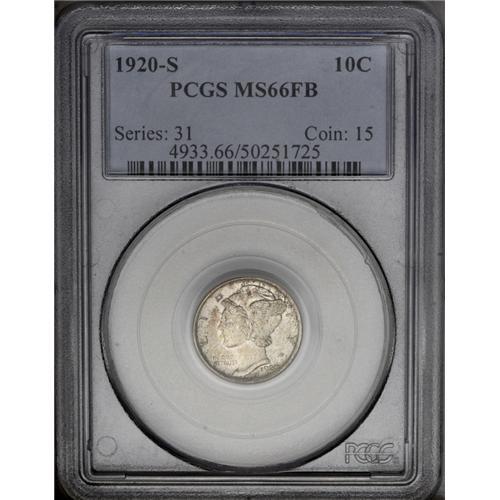 <B>1920-S<10C> MS66 Full Bands PCGS.</B></I> Toned with streaky dark gold over the left obverse field and face of Liberty, which is scarcely noticeable unless a loupe is employed. The reverse sports similar toning with an ivory base of luster, with speckled and somewhat streaky gold over the devices and fields. A boldly struck coin for this date, with no signs of weakness found. As such, this is a very elusive state of affairs, as precious few 1920-S Mercury dimes are known with the desirable combination of a sharp strike and Gem surfaces. No distracting nicks or scratches are found and this is a solid coin for the grade. Population: 7 in 66 Full Bands, 3 finer (3/06).