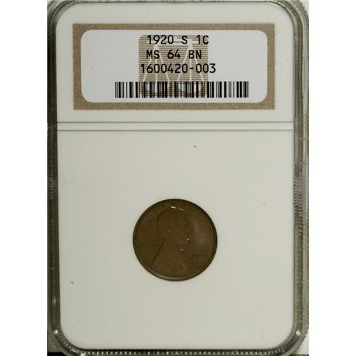 <B>1920-S 1C MS64 Brown NGC.</B></I> NGC Census: (62/18). PCGS Population (23/2). Mintage: 46,220,000. Numismedia Wsl. Price for NGC/PCGS coin in MS64: $232. (#2528)<BR><BR><b>Shipping:</b> Coins & Currency (<a target="_blank" href="http://www.heritageauctions.com/common/shipping.php">view shipping information</a>)