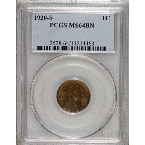 <B>1920-S 1C MS64 Brown PCGS.</B></I> PCGS Population (22/2). NGC Census: (31/9). Mintage: 46,220,000. Numismedia Wsl. Price: $232. (#2528)<BR><BR><b>Shipping:</b> Coins & Currency (<a target="_blank" href="http://www.heritageauctions.com/common/shipping.php">view shipping information</a>)