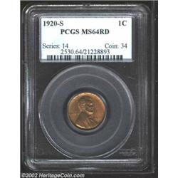 1920-S 1C MS64 Red PCGS. Orange-red in color with a few carbon flyspecks. Scarce any finer and alway