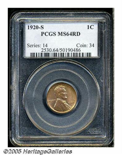 <B>1920-S<1C> MS64 Red PCGS.</B></I> Reddish-golden color overall with an above average strike. Just a few scattered carbon fleck are seen that limit the grade.