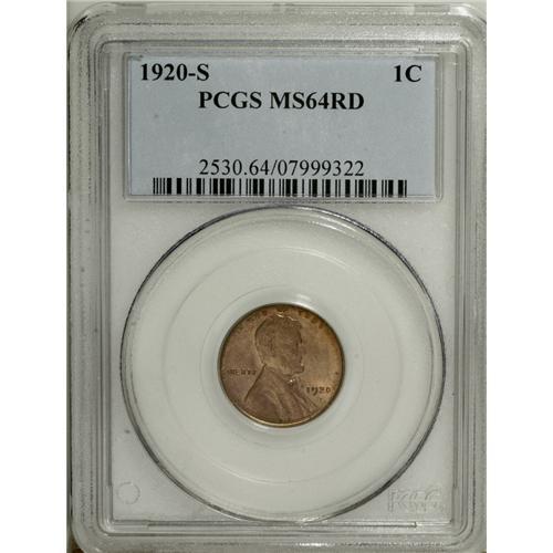 <B>1920-S 1C MS64 Red PCGS.</B></I> The attractive pumpkin-orange surfaces have hardly any carbon. Choice with an above-average level of detail. Population: 82 in 64 Red, 8 finer (11/06).<BR><BR><b>Shipping:</b> Coin/Currency (<a target="_blank" href="http://www.heritageauctions.com/common/shipping.php">view shipping information</a>)