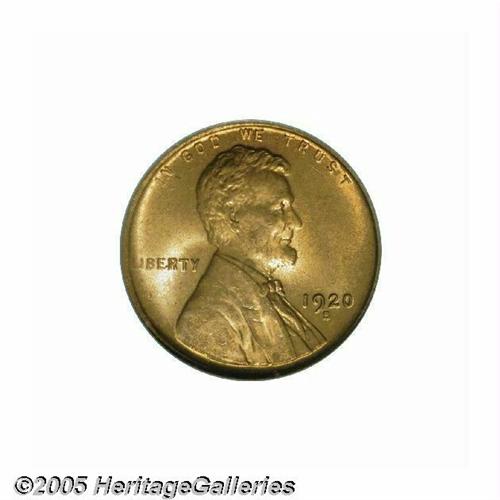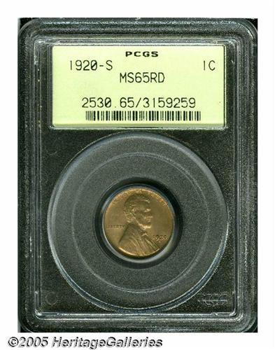 <B>1920-S<1C> MS65 Red PCGS.</B></I> A pretty example that has slightly muted, coppery-red color and is uncommonly well defined for the issue. There are only a couple of very minor abrasions and toning spots on each side. Despite a mintage of more than 46 million pieces, strong demand in the post War economy of the Far West brought most examples into commercial channels and the propensity for weak strikes keeps the modest number of Uncirculated survivors at the lower end of the Mint State spectrum. Population: 8 in 65, 0 finer (6/05).<BR><I>From The William Bickel Collection, Part One.</B></I>