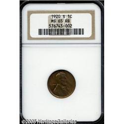 <B>1920-S 1C MS65 Red and Brown NGC.</B></I> Lustrous surfaces display golden-tan patina with some faded crimson accents. A minute contact mark in the right obverse field is mentioned for accuracy. Population: 17 in 65, 0 finer (2/05).