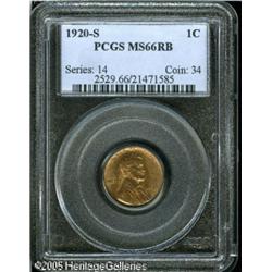 <B>1920-S 1C MS66 Red and Brown PCGS.</B></I> Extremely well struck for a '20-S Lincoln, with golden-tan surfaces that display a near-full Red appearance. A nick on Lincoln's coat is the most obvious blemish. One of the more underappreciated Lincoln issues as a Gem. Currently, this is the single finest example certified by either service (01/05). Lot:5468
