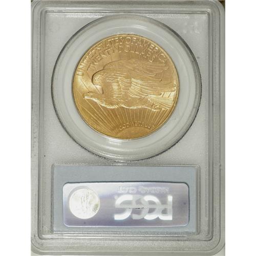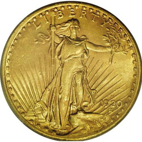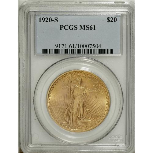 <B>1920-S $20 MS61 PCGS.</B></I> The 1920-S is one of the keys to the series of Saint-Gaudens twenties, and it is a prized find in any grade. A previous estimate by Breen (1988) of "Probably 8-12 survive" is woefully inadequate; nevertheless, most collectors have never seen, much less owned a 1920-S. A more realistic estimate is somewhere around 55-60 examples are extant today in the various grades of Uncirculated. This estimate underscores the unavailability of this issue from the usual hoards from Europe or South America. Apparently the 1920-S was struck, a number were released into circulation, most were set aside in government vaults, apparently none were exported, and what was not distributed or sold in the early 1920s appears to have been melted in the mid-1930s.<BR> This is an attractive example, especially for the grade. Numerous small to mid-sized abrasions seem to be the primary deterrent to a higher grade. The surfaces display pleasing, although somewhat muted mint frost. Both sides also possess rich reddish-golden coloration--a deeper hue than the often-seen orange-gold color, and certainly different from the green-gold pieces that are known. The strike on this coin is somewhat atypical, as the Capitol building, Liberty's toes, and the breast feathers on the eagle are all strongly defined. Only the nose of Liberty shows any weakness.<BR> This coin represents the opportunity for the collector of Saint-Gaudens twenties to acquire this key issue in solid Uncirculated condition.<BR><BR><b>Shipping:</b> Coin/Currency (<a target="_blank" href="http://www.heritageauctions.com/common/shipping.php">view shipping information</a>)