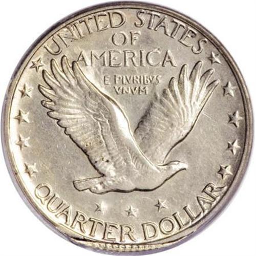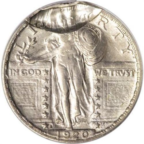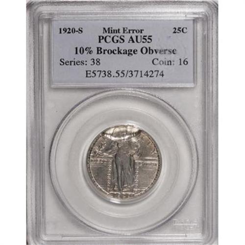 <B>1920-S 25C Standing Liberty Quarter--10% Brockage Obverse--AU55 PCGS.</B></I> The reverse was struck properly, although there is some extruded metal at the bottom border. The obverse, on the other hand, did not receive a complete blow from the die. Rather, the reverse of a previously struck Quarter overlapped the upper 10% of that side causing an indent above Liberty's chest. Minimally worn with silver-gray patina and no singularly mentionable abrasions. Noteworthy Standing Liberty quarter mint errors are extremely rare.<BR><I>Ex: Peter Martinez Collection (Heritage, 1/02), lot 8996.</B></I><BR><BR><B>Coin Engraver:</B> Hermon A. MacNeil<BR><BR><b>Shipping:</b> Coins & Currency (<a target="_blank" href="http://www.heritageauctions.com/common/shipping.php">view shipping information</a>)