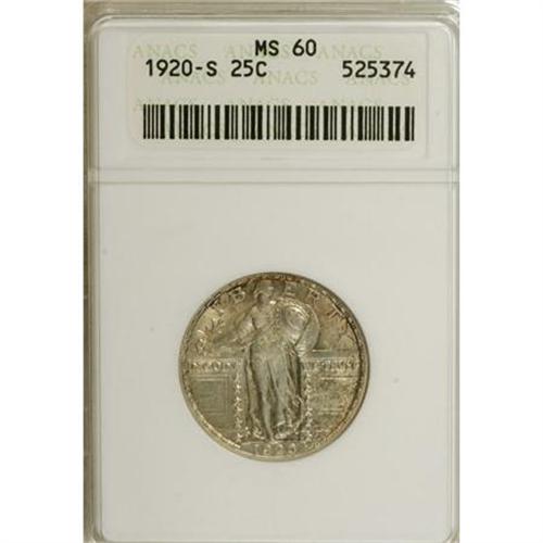 <B>1920-S 25C MS60 ANACS.</B></I> MS60. NGC Census: (2/247). PCGS Population (3/305). Mintage: 6,380,000. Numismedia Wsl. Price for NGC/PCGS coin in MS60: $183. (#5738)<BR><BR><B>Coin Engraver:</B> Hermon A. MacNeil<BR><BR><b>Shipping:</b> Coins & Currency (<a target="_blank" href="http://www.heritageauctions.com/common/shipping.php">view shipping information</a>)