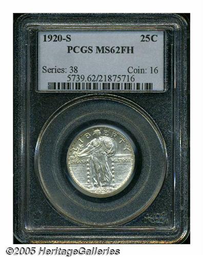 <B>1920-S<25C> MS62 Full Head PCGS.</B></I> Lustrous surfaces are mostly white, with just a few wisps of light tan color in localized areas. The design features are well defined, culminating in the full head designation. Some light marks, including a couple of faint pinscratches, are noted on Liberty's midsection.