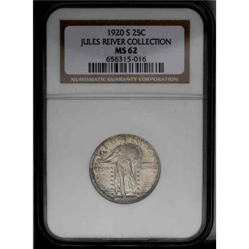 <B>1920-S<25C> MS62 NGC.</B></I> Lightly toned with slightly subdued luster for the grade. Attractive mottled charcoal and russet patina adorns the obverse peripheries. Both sides seem blemish-free. A scarce issue and a more affordable example. Well but not fully struck.