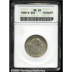 1920-S 25C MS63 ANACS. Lovely aqua, apricot, and gray-green colors decorate the satiny surfaces of this boldly struck, barely marked piece. Miss Liberty's head and the date are not quite completely detailed, and the coin's somewhat subdued luster may be a grade-limiting factor. Important notice: Heritage usually auctions material at the rate of 200-250 lots per hour. On some occasions eBay Live bid software or the Internet may not be able to keep up with the pace of the auction. We recommend placing a realistic absentee bid now as insurance to avoid disappointment. Occasionally the auctioneer may eliminate or reject an eBay Live bid, and the auctioneer may also reopen a lot after the close of the eBay live bidding (usually because we missed an audience bid), and may reject your bid even if it shows you as the winning bidder. By bidding via eBay Live, you agree that Heritage may award the lot to another bidder at its sole discretion under the circumstances described above or any other reasonable circumstances. Also please note that all Heritage lots purchased through eBay Live carry a 20% Buyer's Premium. Please make sure you read the Terms and Conditions before you bid.