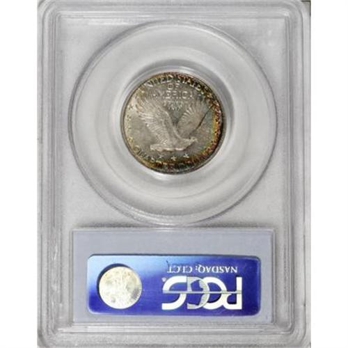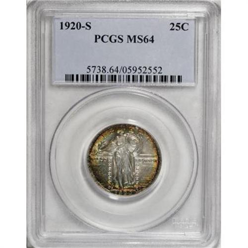 <B>1920-S 25C MS64 PCGS.</B></I> Lustrous, untoned centers give way to the most beautiful orange and emerald-green rim toning imaginable. Although a whisper of friction on the highpoints separates this 1920-S from Gem quality, eye appeal is first rate.<BR><BR><B>Coin Engraver:</B> Hermon A. MacNeil<BR><BR><b>Shipping:</b> Coins & Currency (<a target="_blank" href="http://www.heritageauctions.com/common/shipping.php">view shipping information</a>\)