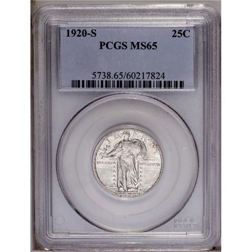 <B>1920-S<25C> MS65 PCGS.</B></I> The surfaces are of true Gem quality, with bright luster on the surfaces and scarce amounts of mottled gray patina on the surfaces. An appealing example of an issue that has seen just sixteen pieces graded finer at PCGS, as of (3/06).