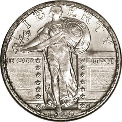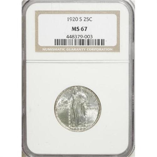 <B>1920-S 25C MS67 NGC.</B></I> The 1920-S is an overlooked issue in the series, and it is also a date that was generally poorly produced. Even though 6.380 million pieces were struck, there are very few high grade examples known today. This Superb Gem specimen is certainly above average with excellent details on all but the head of Liberty and the eagle's breast. Brilliant throughout, the surfaces display outstanding mint frost that swirls around each side in a cartwheel manner. The only imperfection of note is a small planchet flake in the right reverse field. Census: 9 in 67, 0 finer (11/07).<BR><I>From The Hoffy Collection, NGC's #3 Registry Collection of Standing Liberty Quarters.</B></I><BR><BR><B>Coin Engraver:</B> Hermon A. MacNeil<BR><BR><b>Shipping:</b> Coins & Currency (<a target="_blank" href="http://www.heritageauctions.com/common/shipping.php">view shipping information</a>)
