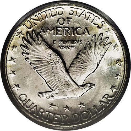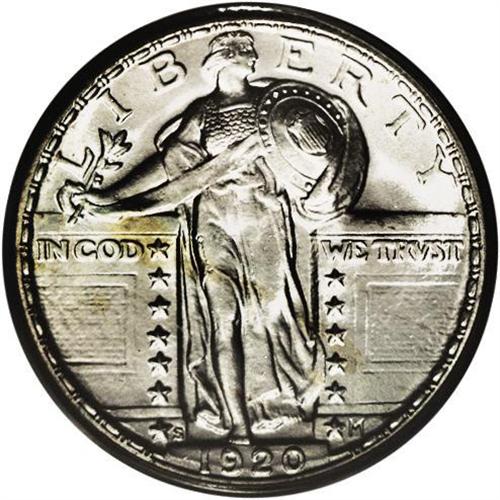 <B>1920-S<25C> MS67 PCGS.</B></I> As an issue, the '20-S is certainly scarce in Mint State, especially considering its relatively large mintage of 6.38 million pieces. The current example is stunning. Bright, exceedingly frosty and well struck, it is nearly brilliant, save for a faint apricot toning streak or two on each side. Only two of the shield rivets and the eagle's breast feathers are a trifle weak. Expertly preserved, the piece is virtually pristine. This is the single finest-graded example of the 1920-S Standing Liberty quarter, according to PCGS. Population: 1 in 67, 0 finer (8/06).