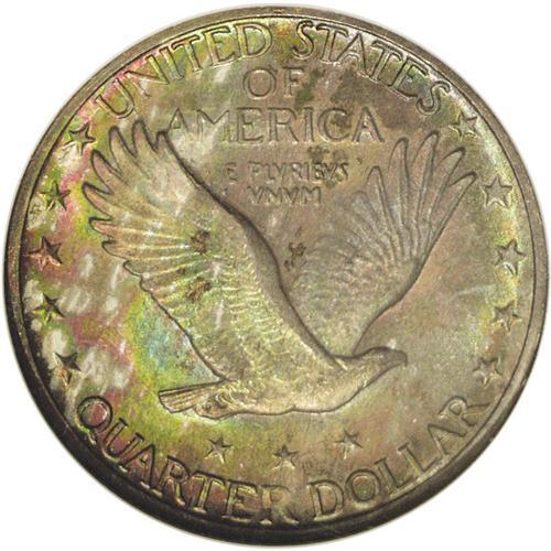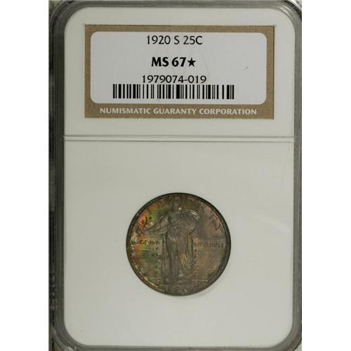 <B>1920-S 25C MS67 <img border='0' src='http://www.heritagecoins.com/images/star.gif' width=10 height=10> NGC.</B></I> Awarded NGC's coveted Star designation for superior eye appeal, this example offers phenomenal toning in mottled hues of magenta, jade-green, and lemon-yellow. The strike is decent as well, although the head and shield details are somewhat soft. Among the finest at either service. Census: 9 in 67, 0 finer (12/06).<BR><BR><b>Shipping:</b> Coin/Currency (<a target="_blank" href="http://www.heritageauctions.com/common/shipping.php">view shipping information</a>)