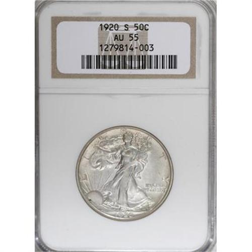<B>1920-S 50C AU55 NGC.</B></I> Whispers of golden toning visit the margins of this S-mint Walker, while the centers have subtle rose and blue accents against the silver-gray surfaces. Well struck with a touch of wear on the highpoints of the minimally marked devices. <BR><BR><B>Coin Engraver:</B> Adolph A. Weinman<BR><BR><b>Shipping:</b> Coins & Currency (<a target="_blank" href="http://www.heritageauctions.com/common/shipping.php">view shipping information</a>)