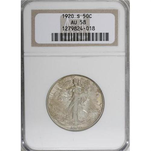 <B>1920-S 50C AU58 NGC.</B></I> Elegant mustard-gold and silver-blue patina drapes the still-lustrous surfaces of this well struck S-mint Walker. A touch of highpoint friction precludes Mint State status, but the fields and devices show few marks overall.<BR><BR><B>Coin Engraver:</B> Adolph A. Weinman<BR><BR><b>Shipping:</b> Coins & Currency (<a target="_blank" href="http://www.heritageauctions.com/common/shipping.php">view shipping information</a>)