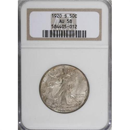 <B>1920-S 50C AU58 NGC.</B></I> NGC Census: (40/232). PCGS Population (35/266). Mintage: 4,624,000. Numismedia Wsl. Price for NGC/PCGS coin in AU58: $650. (#6582)<BR><BR><B>Coin Engraver:</B> Adolph A. Weinman<BR><BR><b>Shipping:</b> Coins & Currency (<a target="_blank" href="http://www.heritageauctions.com/common/shipping.php">view shipping information</a>)