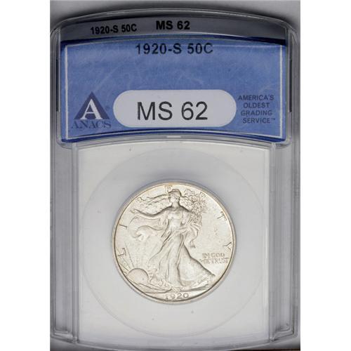 <B>1920-S<50C> MS62 ANACS.</B></I> Well struck and crisply defined on Liberty's hand, with smooth, untoned surfaces that betray slightly weak satin luster and a clean, virtually unmarked reverse. A couple of superficial, parallel pinscratches on the lower left obverse limit the grade.