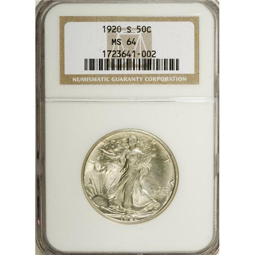 <B>1920-S 50C MS64 NGC.</B></I> Well defined for the issue with some definition on Liberty's branch hand and the eagle's central breast feathers, and numerous raised die striations in the right obverse field, not uncommon to '20-S half dollars. This conditionally scarce example exhibits swirling frosty luster and smooth, essentially untoned features. Census: 81 in 64, 45 finer (10/06).<BR><BR><b>Shipping:</b> Coin/Currency (<a target="_blank" href="http://www.heritageauctions.com/common/shipping.php">view shipping information</a>)
